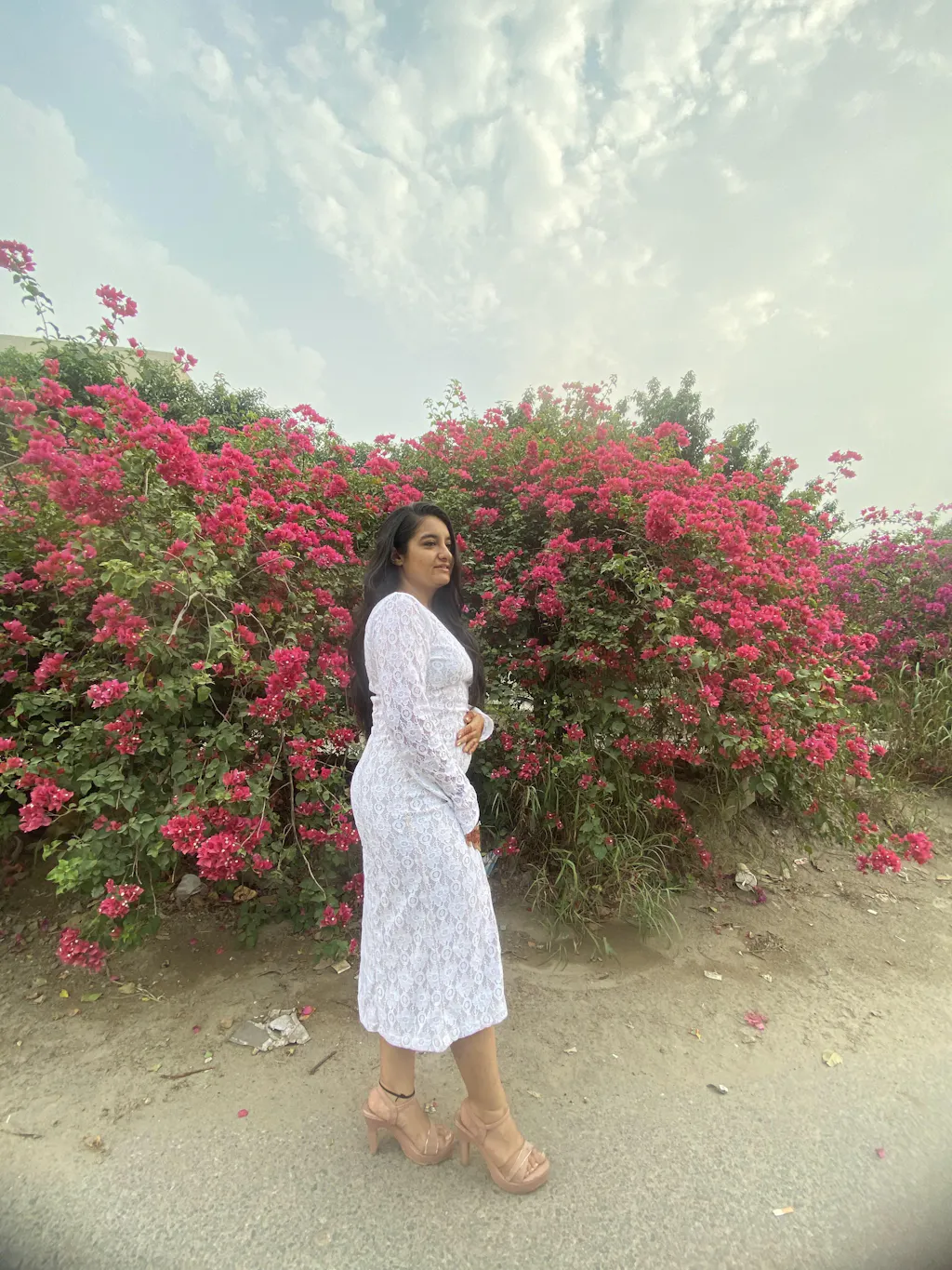 Vomendi White Lace Work Bodycon Dress with Princess Seam and Full Sleeves